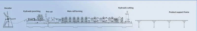 Core parametri: Interretiales processus latitudo 100-600mm, LABIUM 10mm, inspectio crassitudinis 0,5mm; processus sheet metallum 1.5-3mm linteum coloratum (PPGI) et linteum galvanized (GI); productio celeritatis circiter 15m/min.
